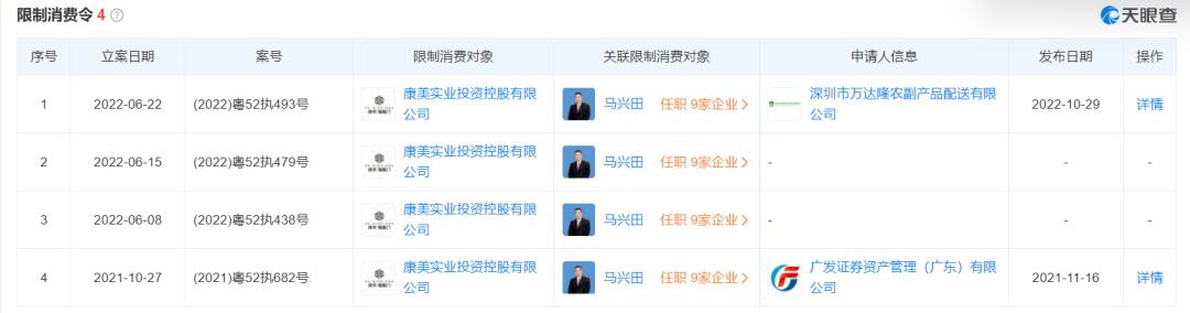 天眼查资料显示,康美实业目前有13条被执行人信息,被执行总额达37.88亿元;10条历史被执行人信息,被执行总金额达115.88亿元。同时,康美实业与其实控人马兴田背负4条限制消费令;立案日期最近的为2022年6月,最远的为2021年10月。