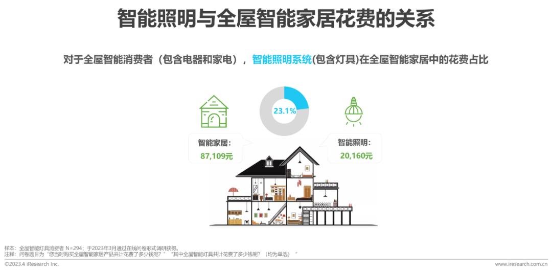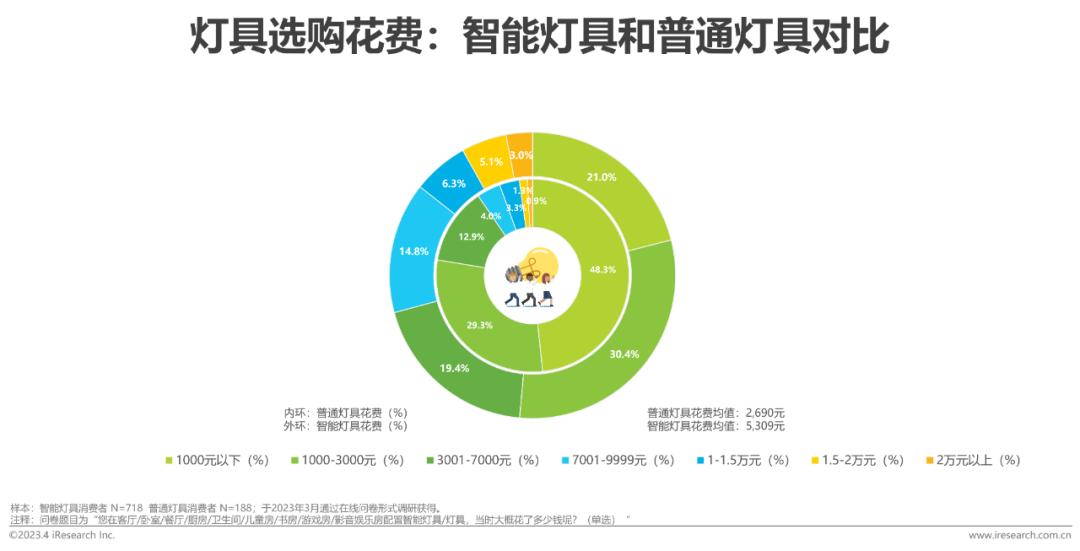 只看灯具的话,智能灯具的平均花费大约为普通灯具的2倍,花费在3000元以上的比例明显比普通灯具更高。而整体智能照明系统而言,除了灯具的花费,系统本身的花费也是比较重要的组成部分,在全屋智能家居中的花费不容小觑。
