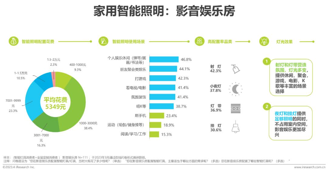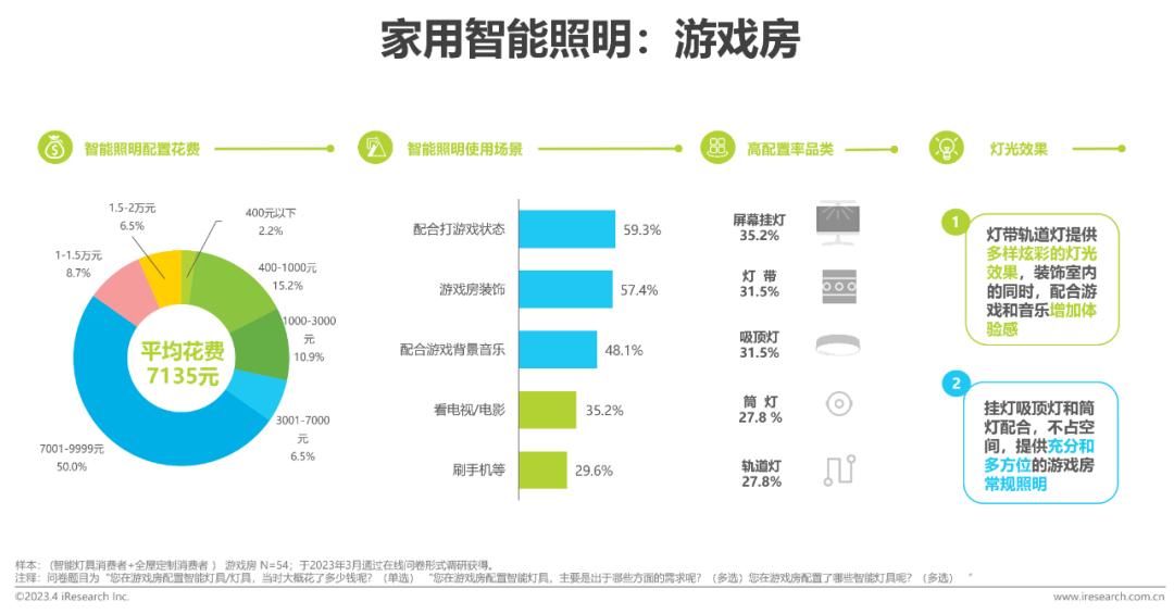 游戏房智能照明花费最高,配合游戏体验的灯光需求是其特色