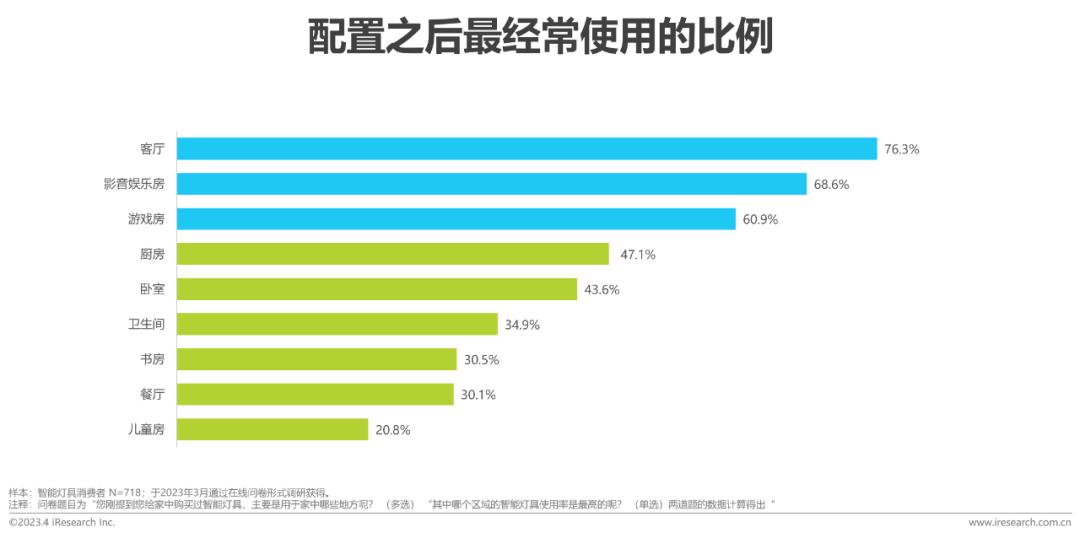 场景使用:消费者在配置智能照明后,在客厅、影音娱乐和游戏房等功能性需求更强的场景使用率最高,达60%以上。