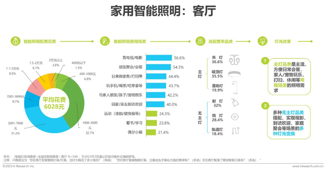 客厅的智能照明花费大多在3000元以上,观影会客是核心场景