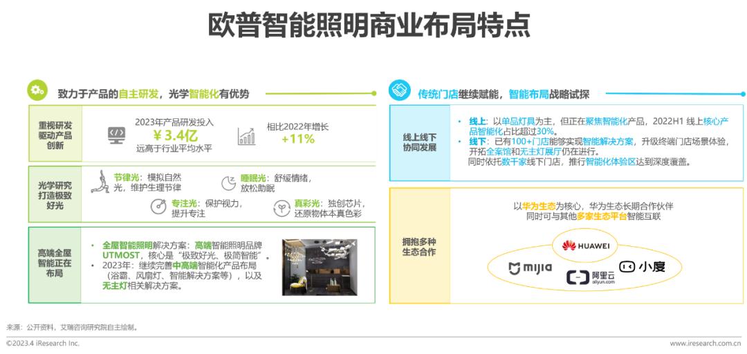 欧普依托传统企业在照明产业里多年的业务积累和强大的自研能力,形成了集光学核心技术、产品核心零部件、完善的营销网络、行业解决方案的全产业价值链。