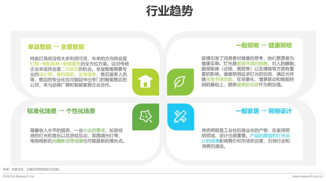 2023年,家用智能照明将进入3.0阶段,全屋智能照明整套解决方案正在快速发展,打造更智能更舒适的家庭光环境将成为趋势。