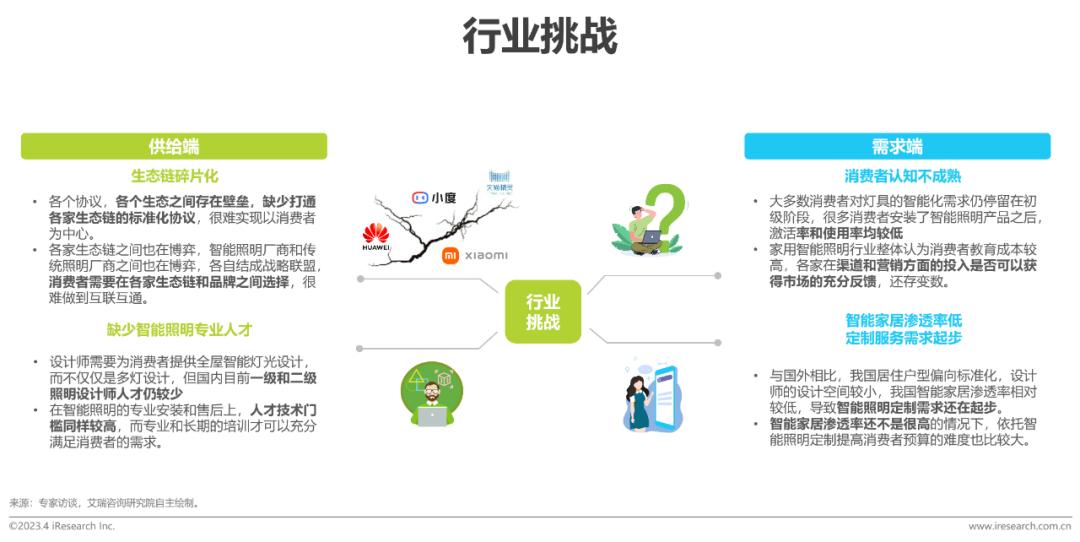 行业挑战:目前照明设计人才缺乏;生态壁垒也导致各企业之间的互通互联受限制从而影响智能照明核心用户对于产品的使用体验。与此同时,大部分消费者仍停留在使用单品智能照明的阶段,对行业了解不深、对场景化照明需求度不高或会限制潜力消费人群的转化。