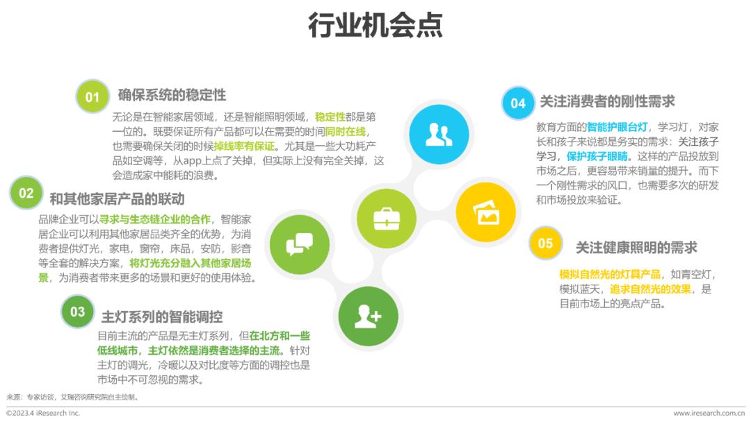 行业机会点:家用智能照明仍处快速发展时期,对于现阶段而言,打造产品系统的稳定性,将灯光更好地融入家居生活以获得用户更优质的使用体验,用户的刚性和健康需求,主灯产品的智能化与产品的健康度或值得行业企业关注。