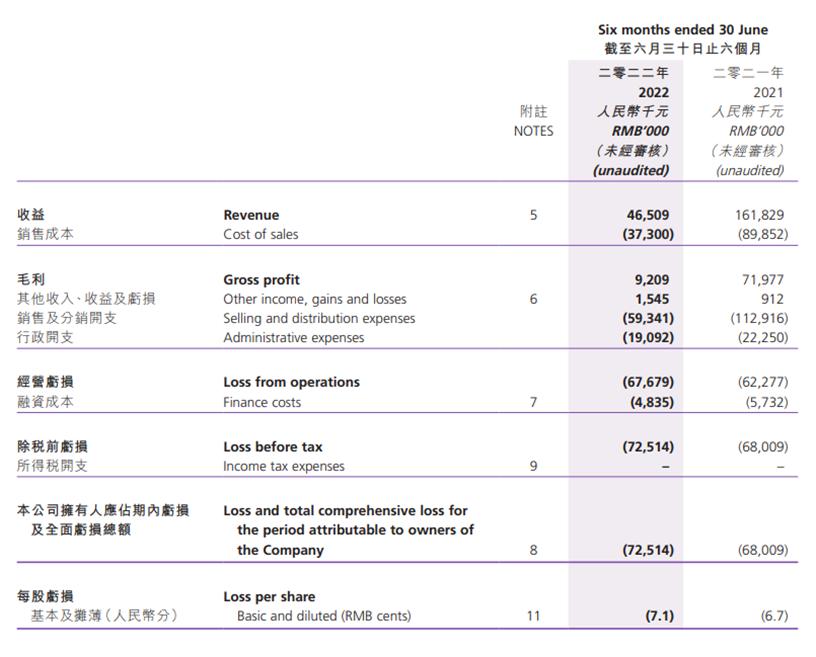根据其2022年中期报告,公司实现收入为4650.9万元,同比下滑71.3%,公司拥有人应占期内亏损为7251.4万元。