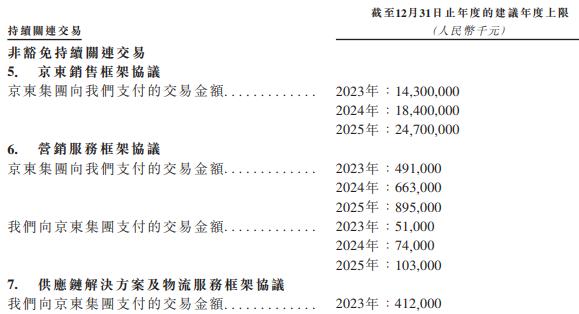 比如,京东销售框架协议是指京东集团将作为京东工业的代理向若干客户出售工业品(包括重点企业及中小企业客户和其他客户)。2020年至2022年,京东集团向京东工业客户销售的工业品金额分别为56.12亿元、85.3亿元、121.16亿元。关于交易的理由,京东工业在申报稿中表示,已与京东集团签署采购协议或下达采购订单的若干客户(包括重点企业及中小企业客户和其他客户)通常会购买各种产品,而工业品仅占该等客户所采购产品的一部分。京东工业2023年至2025年就该交易的建议年度上限分别为143亿元、184亿元、247亿元。