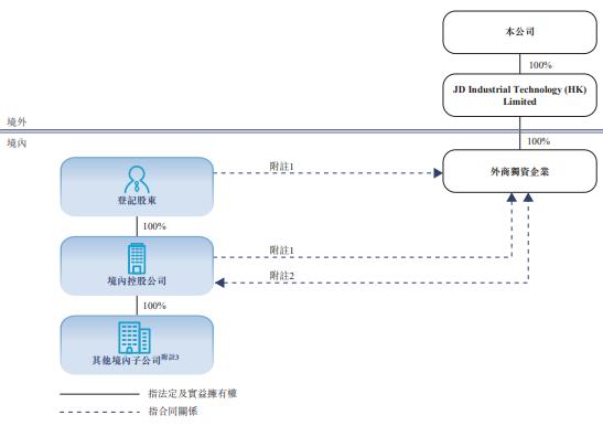 此次港股IPO的主体为成立于开曼群岛的京东工业股份有限公司。由于京东工业当前运营所在行业属于外商投资受限制的领域,京东工业并未直接拥有公司关联并表实体的任何股权。对此,京东工业在申报稿中表示,鉴于监管背景,经咨询法律顾问后,公司确定不可以直接通过股本所有权持有关联并表实体。取而代之,公司决定将通过合同安排,获取业务的实际控制权及其产生的所有经济利益。