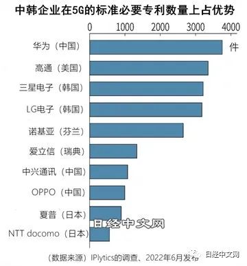 不过,随后中国的华为技术跃居首位。截至2022年,高通仍排在第2位,但第3、4位均被韩国企业占据。在日本企业中,夏普和NTT docomo分列第9位和第10位,但与首位的差距巨大。前十家公司占所有标准必要专利的8成以上。