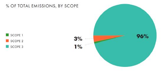 纺织业大部分温室气体的排放来自范围3。根据世界资源研究所(WRI)与品牌环境影响力机构(Aii)发布的报告,基于科学的碳排放目标,平均96% 的温室气体来自范围3的排放。