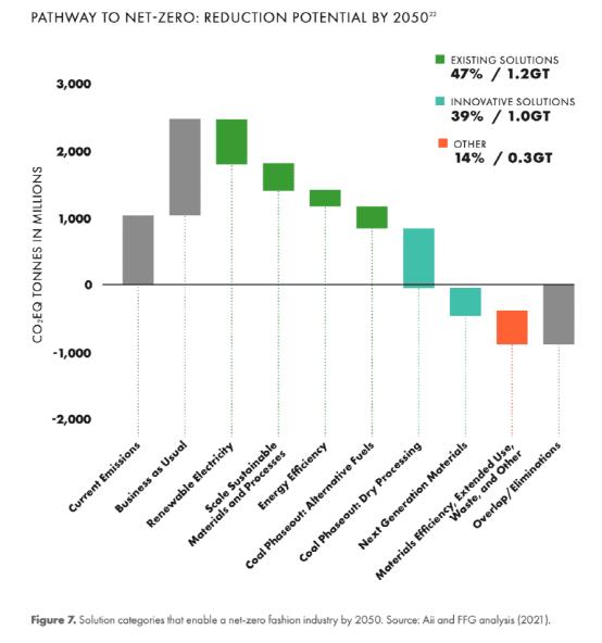 2050年纺织业实现零碳的解决方法,来源:Aii和FFG联合制作的2021分析报告