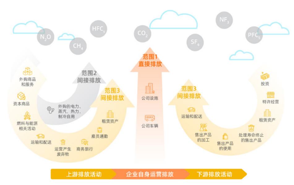 根据国际通用的企业碳排放核算标准,温室气体排放类型被分为范围1、范围2和范围3。