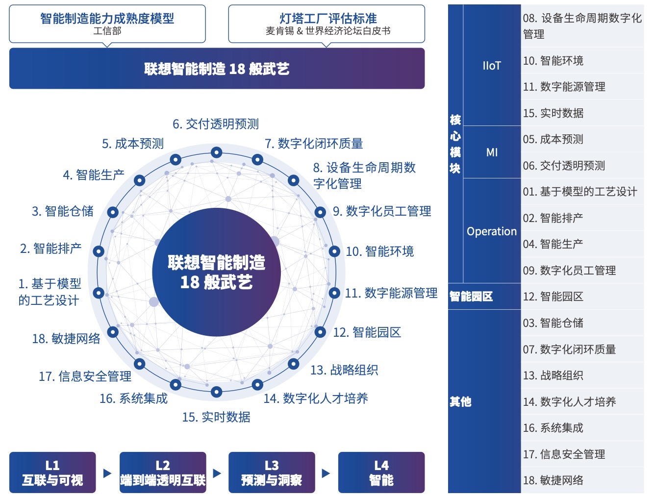 联想智能制造的十八个能力成熟度模型。图源:《联想集团2022社会价值报告》