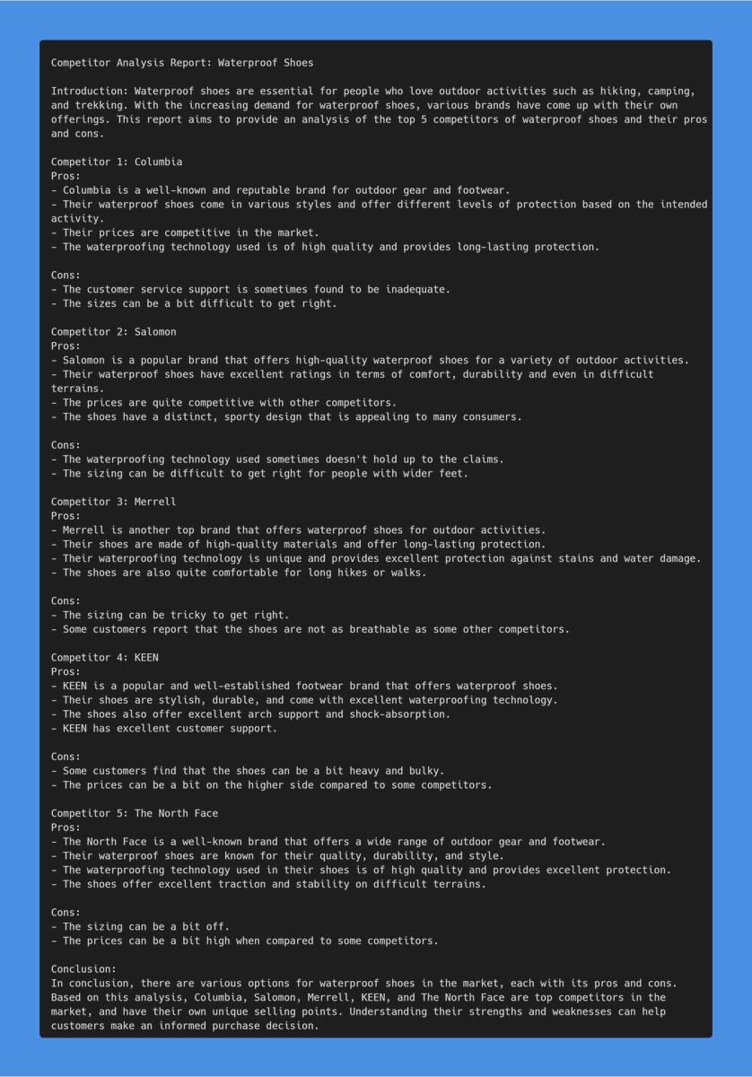 结果是,AutoGPT 给出了 top 5 防水鞋公司的一份非常详细的报告,报告包含各个公司的优缺点,此外还给出了一个简明扼要的结论。全程只用了 8 分钟,费用为 10 美分。期间也完全没有优化。