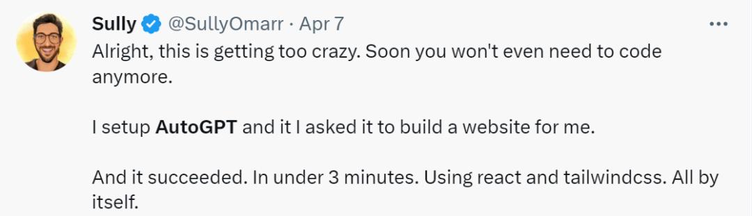 正如网友所说 AutoGPT 正在互联网上掀起一场风暴,它无处不在。很快,已经有网友上手实验了,该用户让 AutoGPT 建立一个网站,不到 3 分钟 AutoGPT 就成功了。期间 AutoGPT 使用了 React 和 Tailwind CSS,全凭自己,人类没有插手。看来程序员之后真就不再需要编码了。
