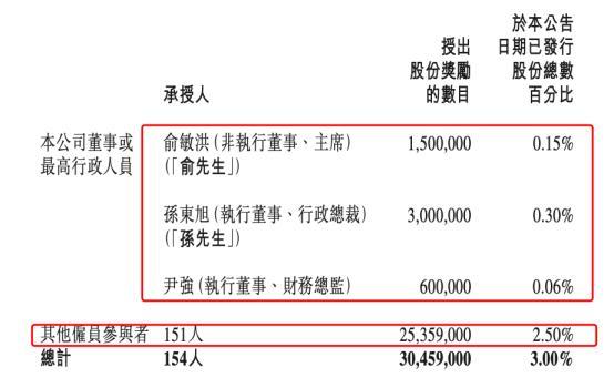 授出总股份数额为3045.9万股,总价值8.83亿港元,获得股份奖励员工数154人,人均487万港元,折合人民币427万。授出股权发行价为零,即免费发给东方甄选获奖员工。其中,三名高管获得510万股,分别是东方甄选CEO孙东旭300万股,价值7632万,董事长俞敏洪150万股,价值3816万,财务总监尹强60万股,价值1526万。