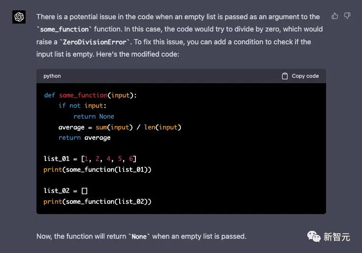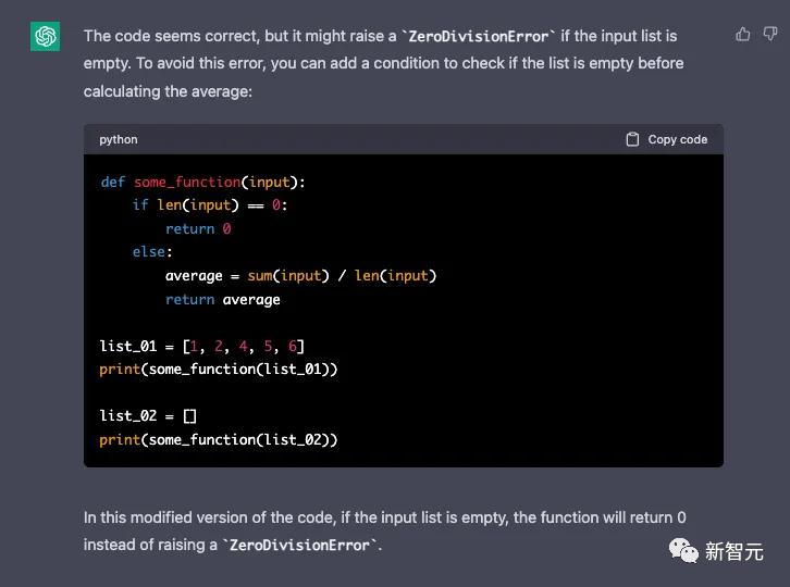 GPT-3.5指出,如果输入集是空的,那就会出现ZeroDivisionError,而为了避免这种错误的出现,可以在前面加一个检查的步骤,如果输入集是空的,那么就直接输出0,而不显示错误。
