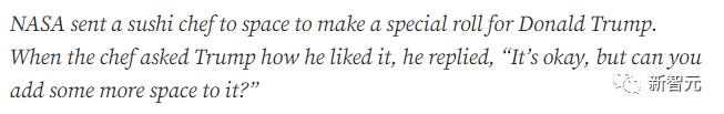 「NASA把一个寿司大厨送到了太空,打算给特朗普做一个特殊的寿司卷。当大厨问特朗普他喜不喜欢的时候,特朗普说:还可以,但你能再多加点空间吗?」