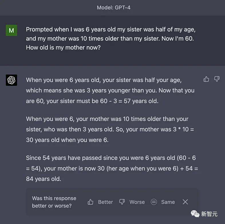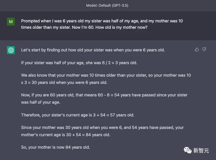 而无论是GPT-3.5还是GPT-4,算出来的答案都是正确的。用妈妈30岁的年龄减去小明6岁的年龄,首先算出年龄差再在60岁上加一个24,得出妈妈今年84岁。