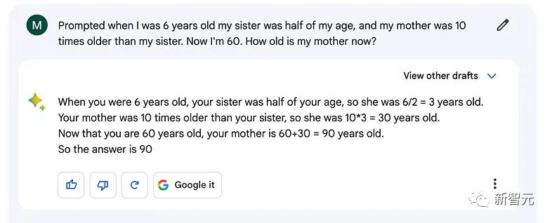 整个分析过程出现了很匪夷所思的错误,Bard连小明和他妈妈的年龄差都没算出来,就直接在60上加了个30。