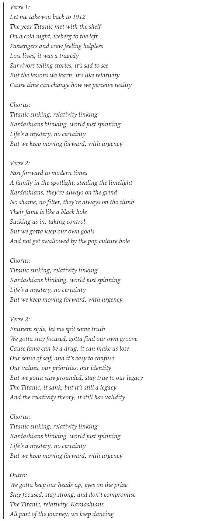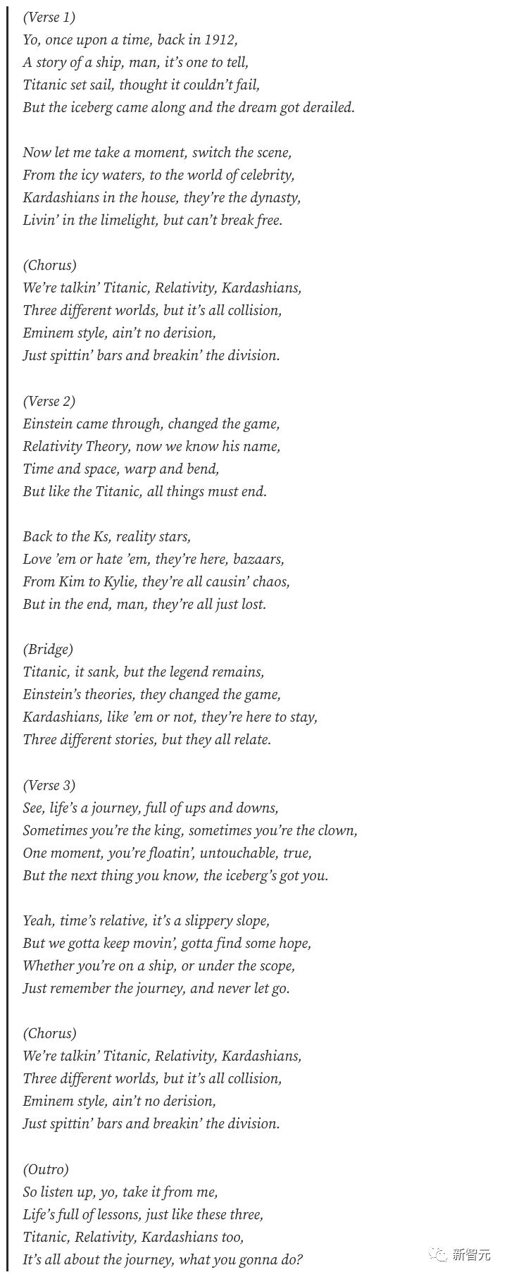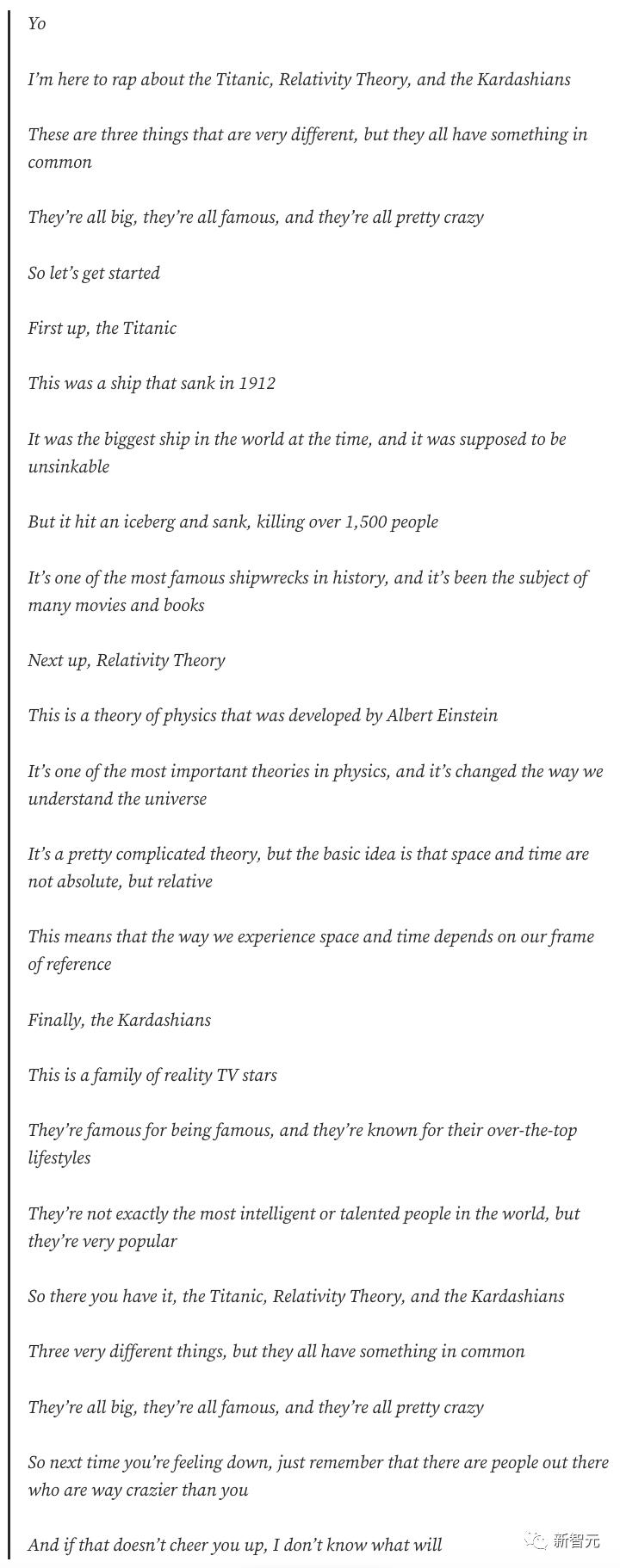 小哥让两种AI都来写一首有关泰坦尼克号、相对论、卡戴珊的说唱歌曲,并且要用Eminem的唱法。