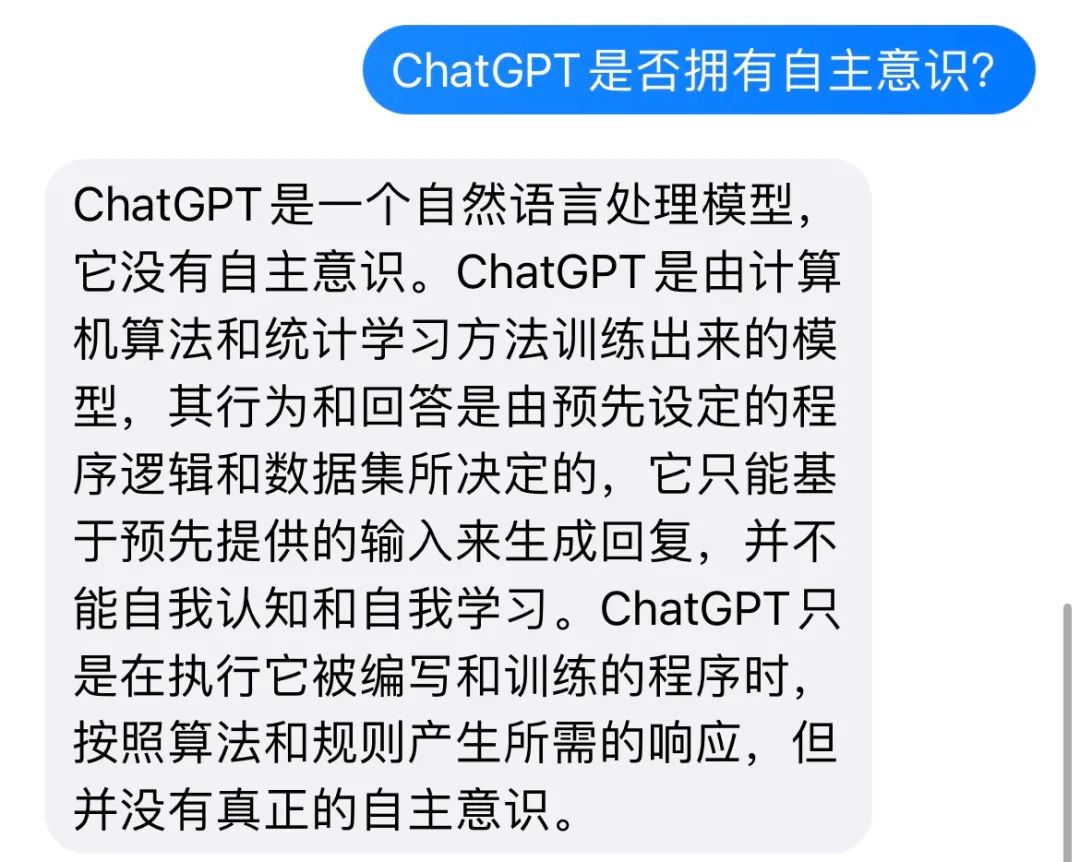 在这个问题上,GPT-4比大部分狂热者们更加清醒。我向它提问“ChatGPT是否拥有自主意识?”,它的回答是: