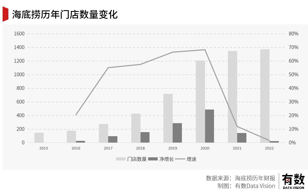 在这一年中,海底捞开启了成立以来最为迅猛的拓店计划,年内门店数量增加486家,增速达到历史最高。