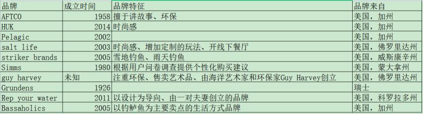 基于公开资料,笔者查找到了 10 个美国市场上比较头部的钓鱼服装品牌。特别提一下,在做统计的时候,笔者的筛选规则是“以钓鱼服装为主要产品”的品牌,因此在这个过程中筛掉了一些做渔具为主同时也出售钓鱼服装的品牌,以及一些关注泛户外(包括打猎、露营等)的品牌。