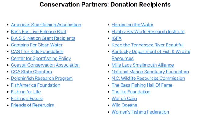 而 1958 年成立的品牌 AFTCO 对海洋环境的保护主要体现在对海洋保护相关的公益组织的捐款上。在 AFTCO 的官网上,可以看到一个 AFTCO 的捐款伙伴的名单,据介绍,AFTCO 每年都会拿出利润的 10% 用于捐款,保护渔业可持续发展。