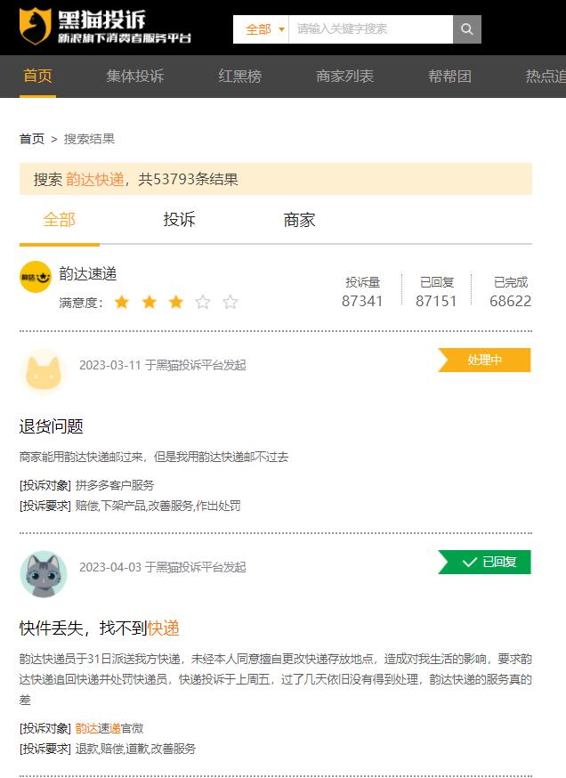 而在第三方投诉平台黑猫投诉上,关于韵达快递的投诉条数高达53793条。当然了,第三方投诉平台或许需要进一步甄别投诉真实性,但是类似这样的声音多了,对于品牌可能会是一种伤害。