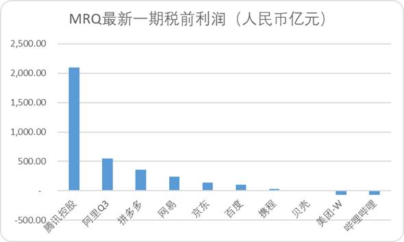 再来看税前利润,同样是统计了市值前十的公司,腾讯的税前利润一枝独秀,超过了2000亿人民币,阿里超过了500亿人民币。其余企业均未超过500亿的门槛,美团、哔哩哔哩还处于亏损阶段。