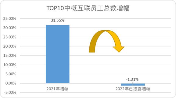 除了成本端费用率的下降,人员成本的下降更为明显。2020年末至2021年末,前十中概互联的企业员工人数增长超过3成,而去年全年员工人数下降了1.31%。
