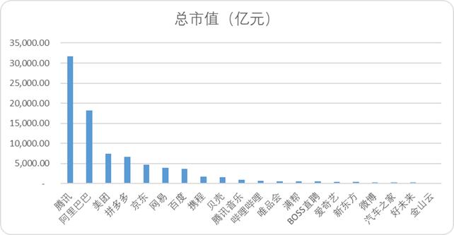 第三档为美团、拼多多、京东、网易和百度,都在4000亿人民币左右。