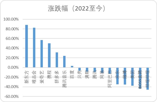 从个股角度来看,2022年至今,转型直播带货的新东方涨幅最高,达到了88%,其次是唯品会、爱奇艺。跌幅最高的是哔哩哔哩、BOSS直聘和美团。
