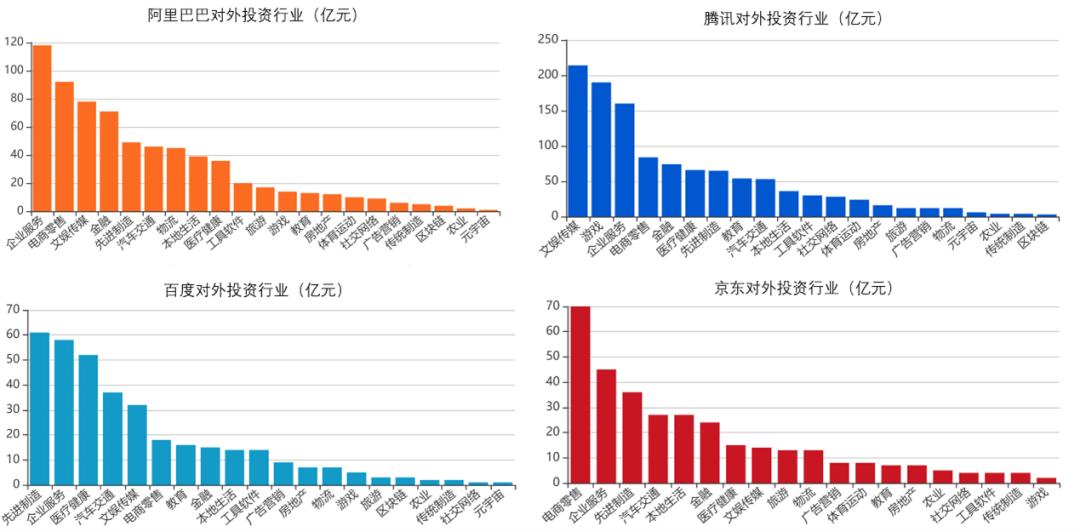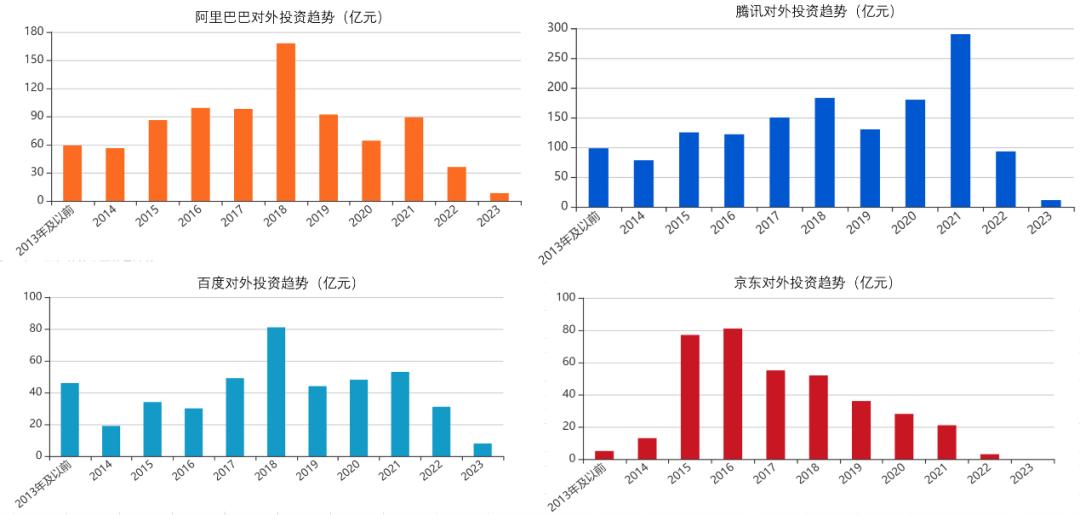 我们可以看到BATJ四家企业自2021年后的对外投资趋势均出现了明显的下滑。并且各自都投资主线逐渐确立,不再存在不同的资本财团围攻抢夺单一项目的历史。
