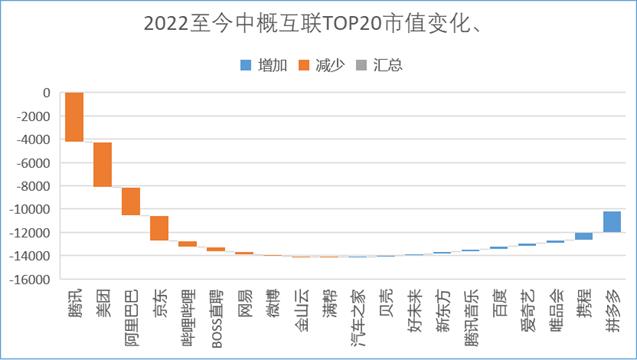 我们统计了自2022年伊始至今中概互联TOP20的市场表现,可以看到市值下降最明显的是腾讯、美团和阿里巴巴,三者市值缩水均超过了1万亿人民币。而市值增长最多的是拼多多,增长了近1900亿人民币。