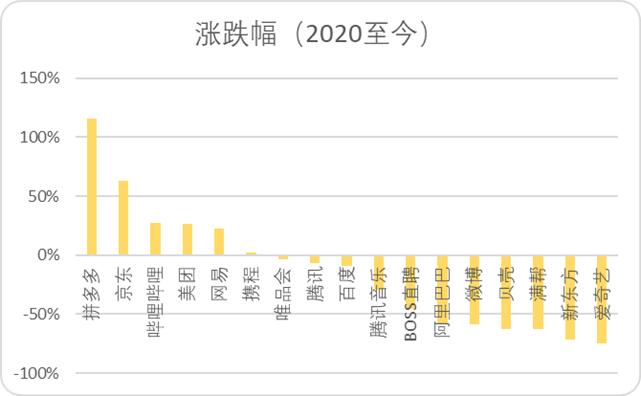 如果我们把时间线拉长,统计自2020年以来的涨跌幅,中概互联TOP17(美股TOP15+美团腾讯)中,有6家增长,11家跌。