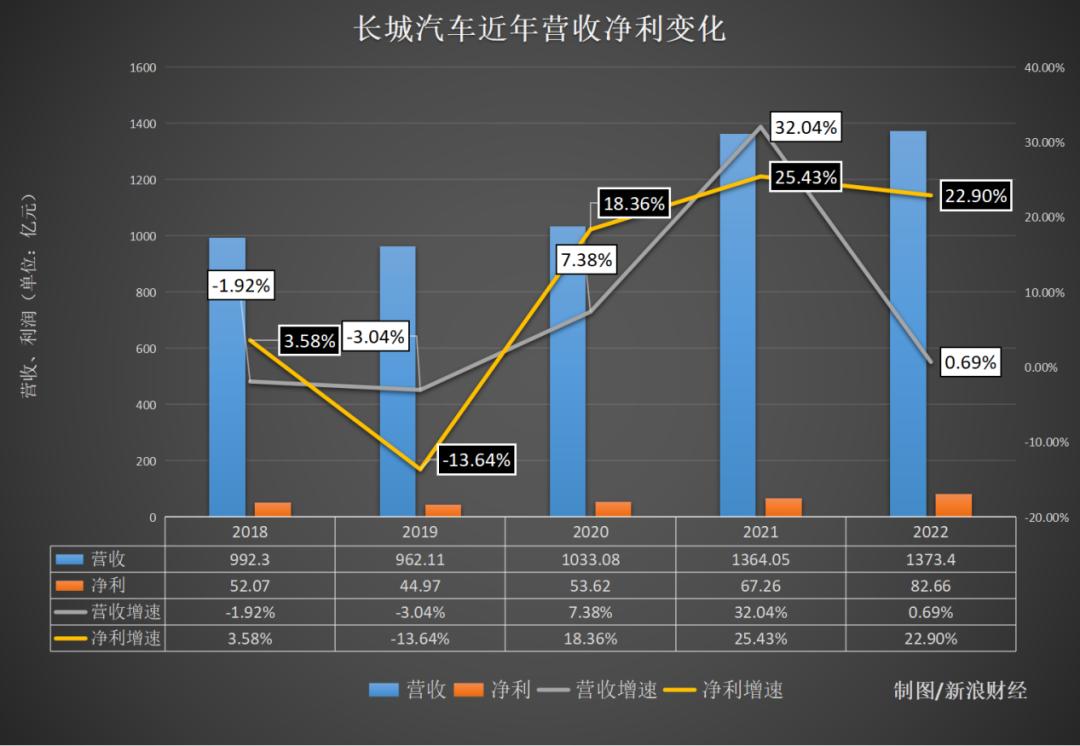 其2022年财报显示,长城汽车营业收入1373.4亿元,同比微增0.69%;归属于上市公司股东的净利润82.66亿元,同比增长22.9%。