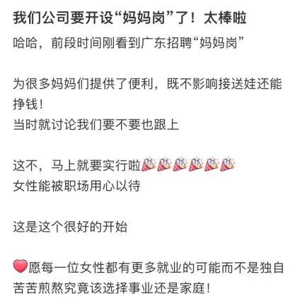 与此同时,质疑也如期而至:“妈妈岗”是有必要专门单独设立的岗位吗?这是不是把育儿的责任全部推到女性身上了呢?