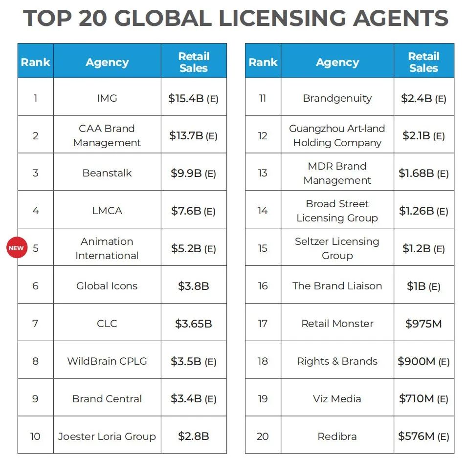 紧随IMG之后的No. 2是CAA,它的零售额为137亿美元,排名第三的Beanstalk公司为99亿美元,第四的LMCA公司的零售额则为76亿美元,排名第五的国际影业是香港公司,拥有哆啦A梦、龙珠、面包超人等几十个动漫形象IP在部分亚洲地区的授权代理,以零售额52亿美元闯入前5名。