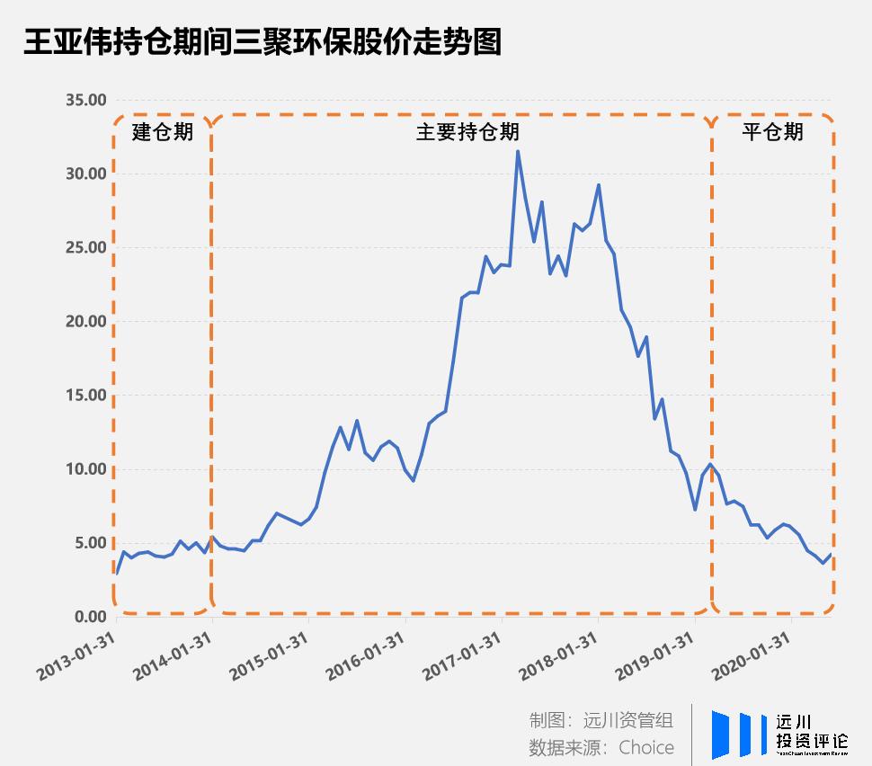 等到股价顶点的2017年一季度时,王亚伟通过「昀沣」、「昀沣3号」等基金,至少持有3500万股三聚环保,以当时的股价计算,市值超过21亿,几乎是千合资本管理规模的十分之一。