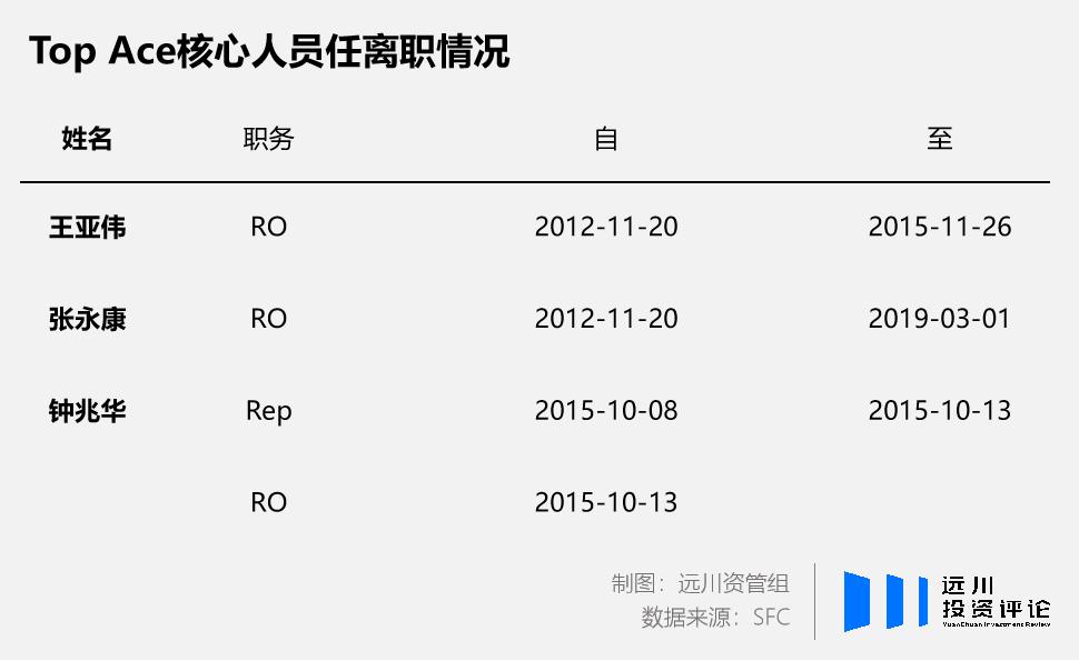 Top Ace是一家注册在香港的对冲基金,在香港从事证券活动的机构和个人都要受到香港证监会(SFC)的监管。SFC资料显示,2015年10月8日钟兆华以代表人身份(Representative,Rep)加入Top Ace,随后在10月13日转为负责人(Responsible Officer,RO)。钟兆华是美林股票研究员出身,加入Top Ace前曾于摩根士丹利亚洲有限公司等多家企业任职高层[2][3]。