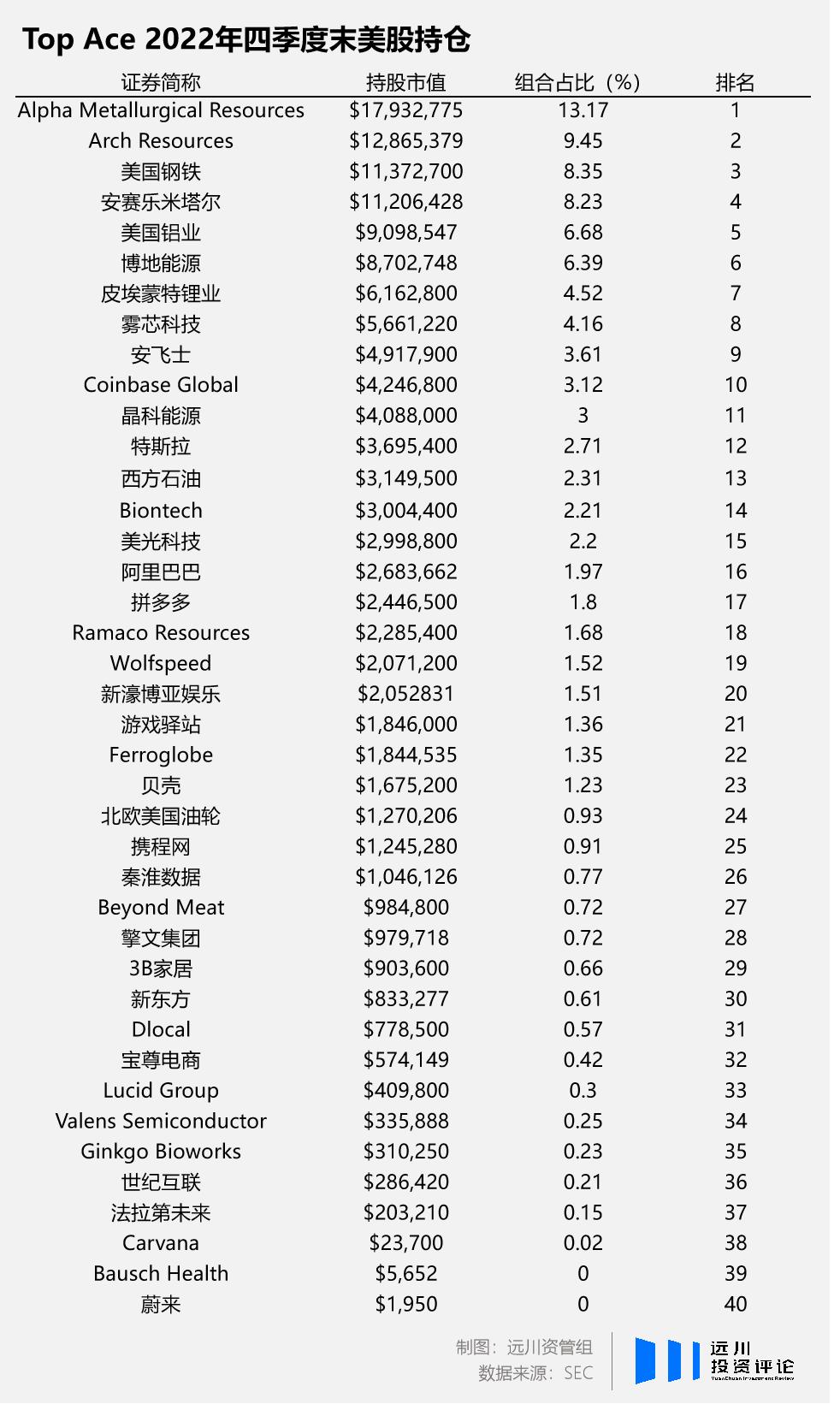 如果看这份13F的持股名单,Top Ace的品味其实五花八门,从电子烟雾芯科技到拼多多,从散户概念股GME到贾老板的法拉第未来。但前六大持仓全部属于材料与能源行业,具体说来,是3家煤炭公司,2家钢铁公司,1家铝业公司。