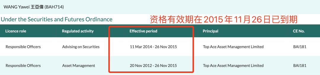 2015年11月26日,王亚伟正式从Top Ace卸任。SFC的数据显示,王亚伟的持牌有效期自2015年11月26日已经终止,根据香港相关机构人士的说法,这就意味着,从合规角度出发,Top Ace的任何投资都不是王亚伟在做了。