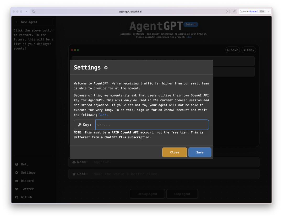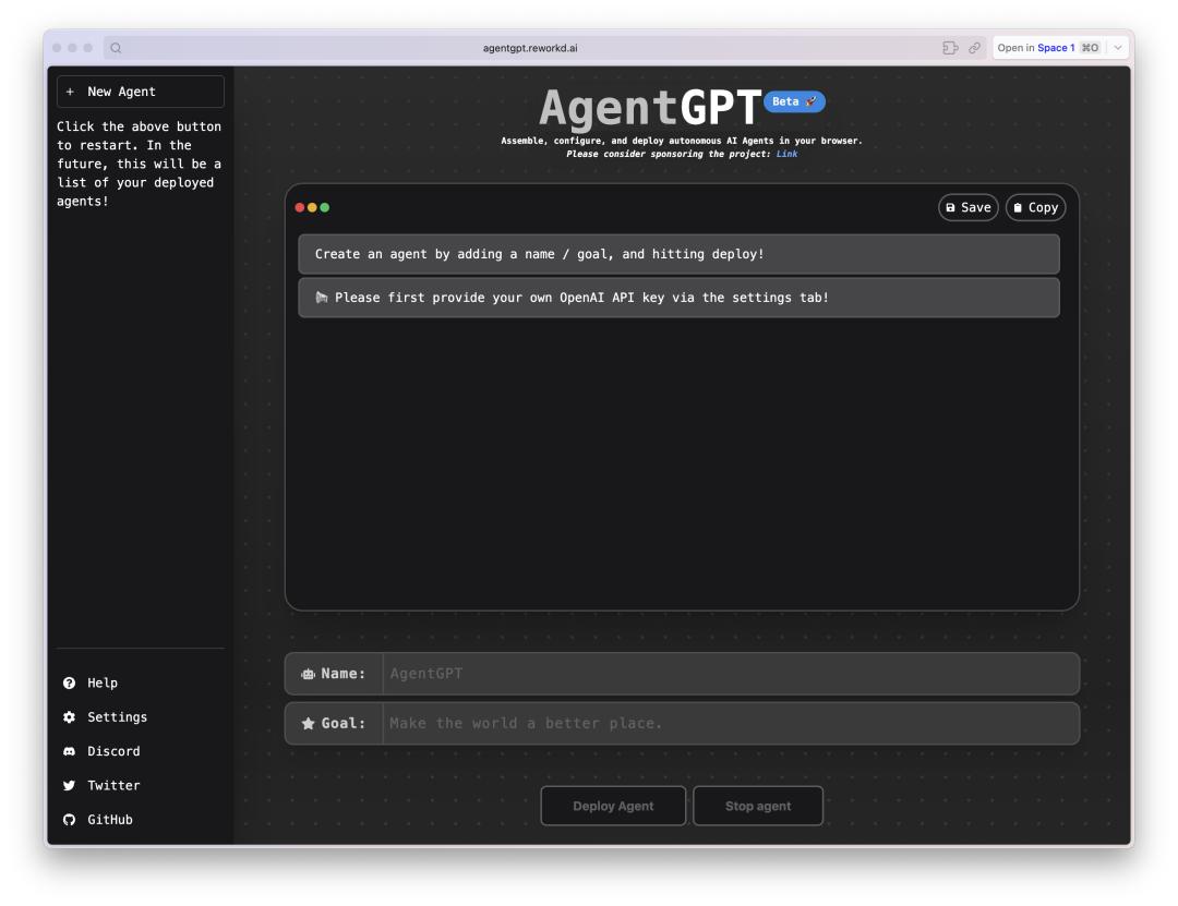 打开https://agentgpt.reworkd.ai,输入你从 OpenAI 那里买来的 API 密钥,就能使用了。