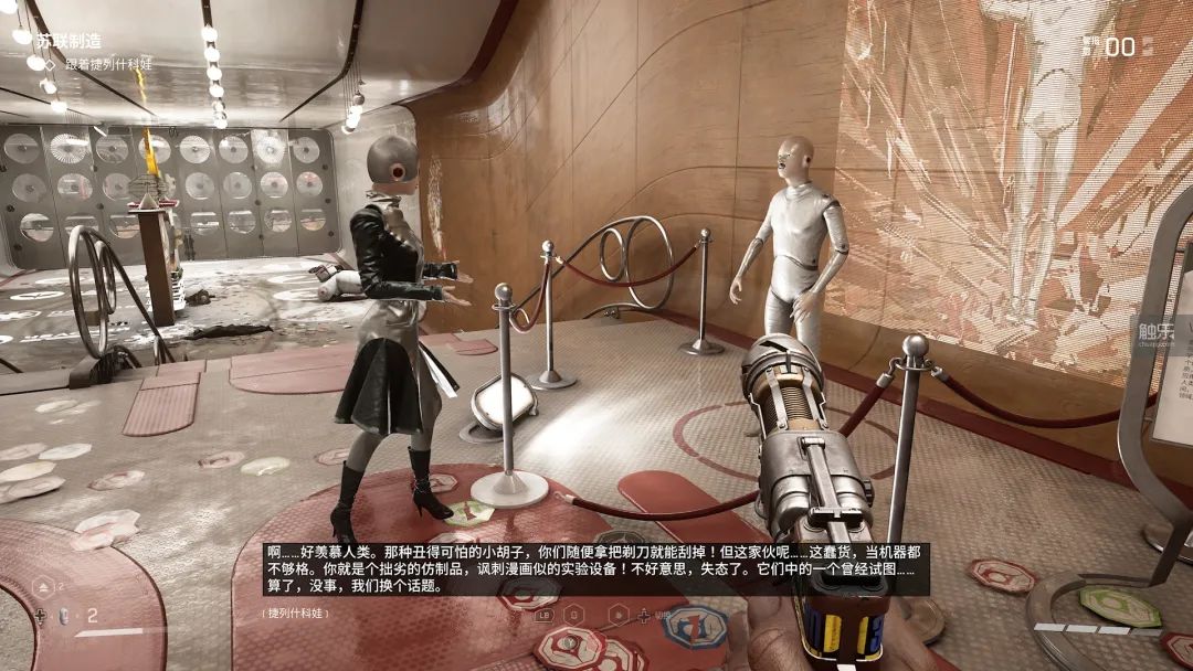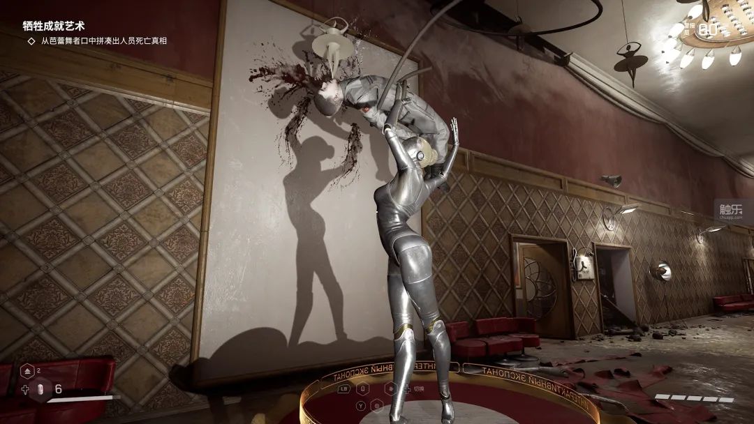 其二是大剧院里给芭蕾舞机器人下指令,让她们摆出特定舞蹈动作。她们的身姿在背后墙上的投影和那些倒霉的工作人员的尸体拼合成图画,慑服彼得罗夫,让他开门。这一段美与恶相交织,你对那些芭蕾舞机器人下指令的动作又和剧场那条暗线(经理胁迫年轻的舞蹈演员们“陪”高官,为他自己的仕途铺路)相映衬,完全称得上妙手天成。对我来说,这个段落是整个游戏里最出彩的惊奇时刻,没有之一。