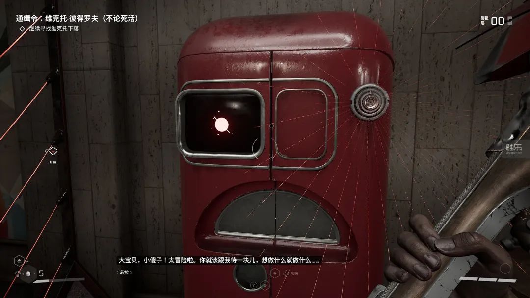 甚至在一些设计细节上,你也能发现《原子之心》对“生化奇兵”的借鉴。《原子之心》里也有着大量隔着玻璃窗观看脚本事件的桥段。游戏早期向玩家展示红色激光陷阱和叶芽的时候都用到了这样的设计手法。这个手法在“生化奇兵”系列里留下了不少名场面,《生化奇兵》里的大老爹、《生化奇兵:无限》里的伊莉莎白,他们的初次登场都是以这样的手法展现给玩家的。