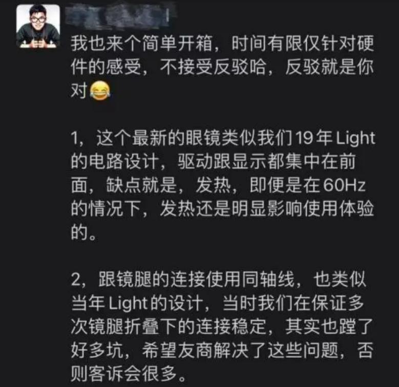 至于Rokid Max发布后,Nreal CEO针对这款产品发布了简单的开箱测评,其中就明确指出几大问题,比如Rokid Max采用了类似Nreal在2019年推出的Nreal Light眼镜的电路设计,驱动跟显示都集中在前面,容易发热。