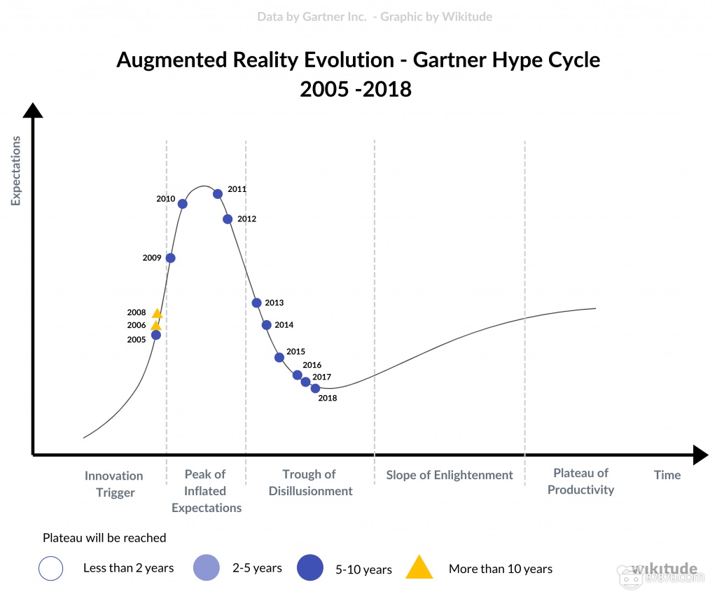 套用Garnter曲线来看,2012年谷歌推出新品,而后2016年出现了泡沫,之后行业进入恢复期,如今正处于泡沫出清,技术开始成熟的爆发前夜,AR产业正在正向螺旋上升。