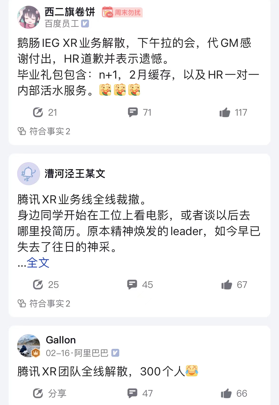 在国内,腾讯似乎也在调整XR业务。脉脉上有用户表示,“鹅肠IEG XR业务解散”“腾讯XR业务线全线裁撤”等等,对于市场的这类传言,腾讯则表示其并未放弃探索XR,但仍会考虑其他发展方向。